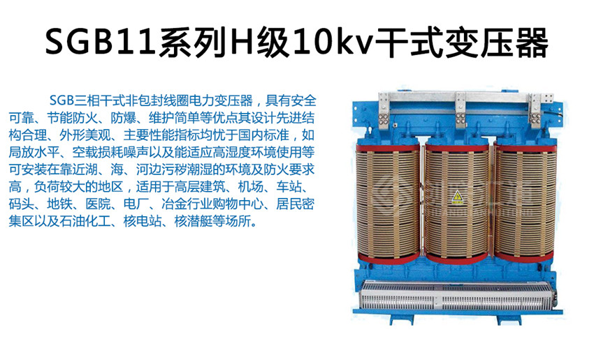 SGB11系列H級絕緣干式變壓器采用優(yōu)質(zhì)環(huán)保材料,先進(jìn)的生產(chǎn)檢測設(shè)備按嚴(yán)格的工藝生產(chǎn)而成,具有高性能、高安全、承受熱沖擊能力強等特點,它適用于防火要求高、負(fù)荷波動大以及污穢潮濕的惡劣環(huán)境中。如:高層建筑、商業(yè)中心、住宅小區(qū)、醫(yī)院、化工廠、核電站、船舶及其它安全性要求防火、防爆、防潮的配電網(wǎng)絡(luò)與工礦企業(yè)供配電系統(tǒng)等重要或特殊環(huán)境場所。根據(jù)不同的使用環(huán)境,可配置不同的防護(hù)等級.變壓器可按用戶需要帶有溫度控制和溫度顯示系統(tǒng),可和溫控系統(tǒng)配合使用。